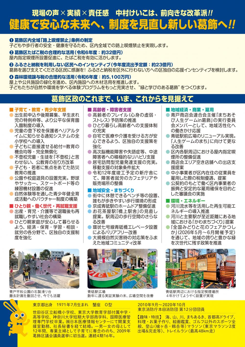 中村区議こそ、葛飾区に必要な人財。区民の皆さまへ、正直に向き合い、懸命に皆さまと地域の発展のために、フットワーク軽く働いていくことができる人です。