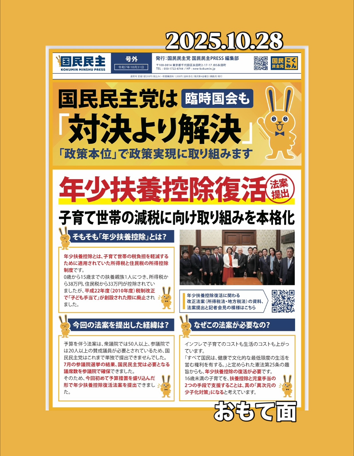 📰 2025年10月28日 【国民民主PRESS号外(政策ビラ)発行のお知らせ】 臨時国会も「対決より解決」 年少扶養控除復活へ、子育て支援の強化を! 障がい福祉における「18歳の壁」対策や、インテリジェンス強化も前へ。 国民民主党は政策実現に本気です! 🟨🔷🟨🔷 🟨🔷🟨🔷 🟨🔷🟨🔷🟨 #国民民主党 #対決より解決 #政策本位 #年少扶養控除復活 #子育て支援 #少子化対策 #臨時国会