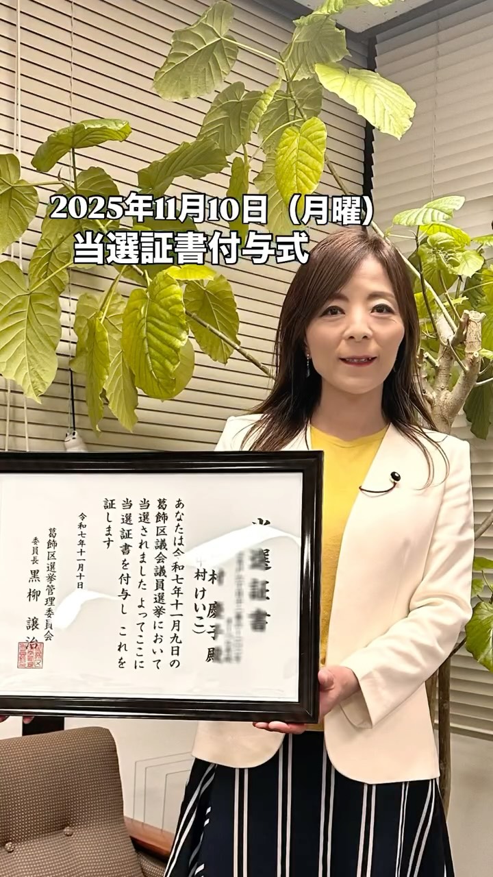 ㊗️ 【葛飾区議会議員選挙 結果のご報告】 たくさんの応援、本当にありがとうございました! 定数40名のところ、65名が立候補した今回の葛飾区議会議員選挙。 結果は、 ●自民党17名(現職12名)のうち10名、 ●公明党7名全員(新人3名)、 ●立憲民主党4名のうち3名(新人2名)、 ●共産党5名のうち4名、 ●維新・都ファは各2名のうち1名。 ●参政党、再生の道、生活者ネットも各1名ずつが議席を獲得しました。 そして、国民民主党は、 立候補した2名がそろって当選✨ 新人の鈴木達士くんが5位(3910.657票) 私が7位(3541.915票)でした。 2009年に民主党公認で初当選し、一旦は無所属になったものの、政策理念が完全に合致するこの政党で骨を埋めようと2023年7月に国民民主党に入り直しました。 どんなポジションでいても、変わらずに私に支持してくださっている励ましのお声を、期間中に聞くことができ、涙が出るほど有り難かったです😭 ご支援くださった皆さまのおかげです。心から感謝申し上げます🙏 これからも、仲間となった鈴木達士くんとともに、「対決より解決」「現場主義」で、区民の声をまっすぐに区政へ届けてまいります! 引き続き、皆さまにはご指導賜りますよう宜しくお願い申し上げます。 本当にありがとうございました🙇‍♀️ #当選証書付与式 #葛飾区議会議員選挙 #国民民主党 #葛飾区議会議員 #中村けいこ #葛飾区 #青戸