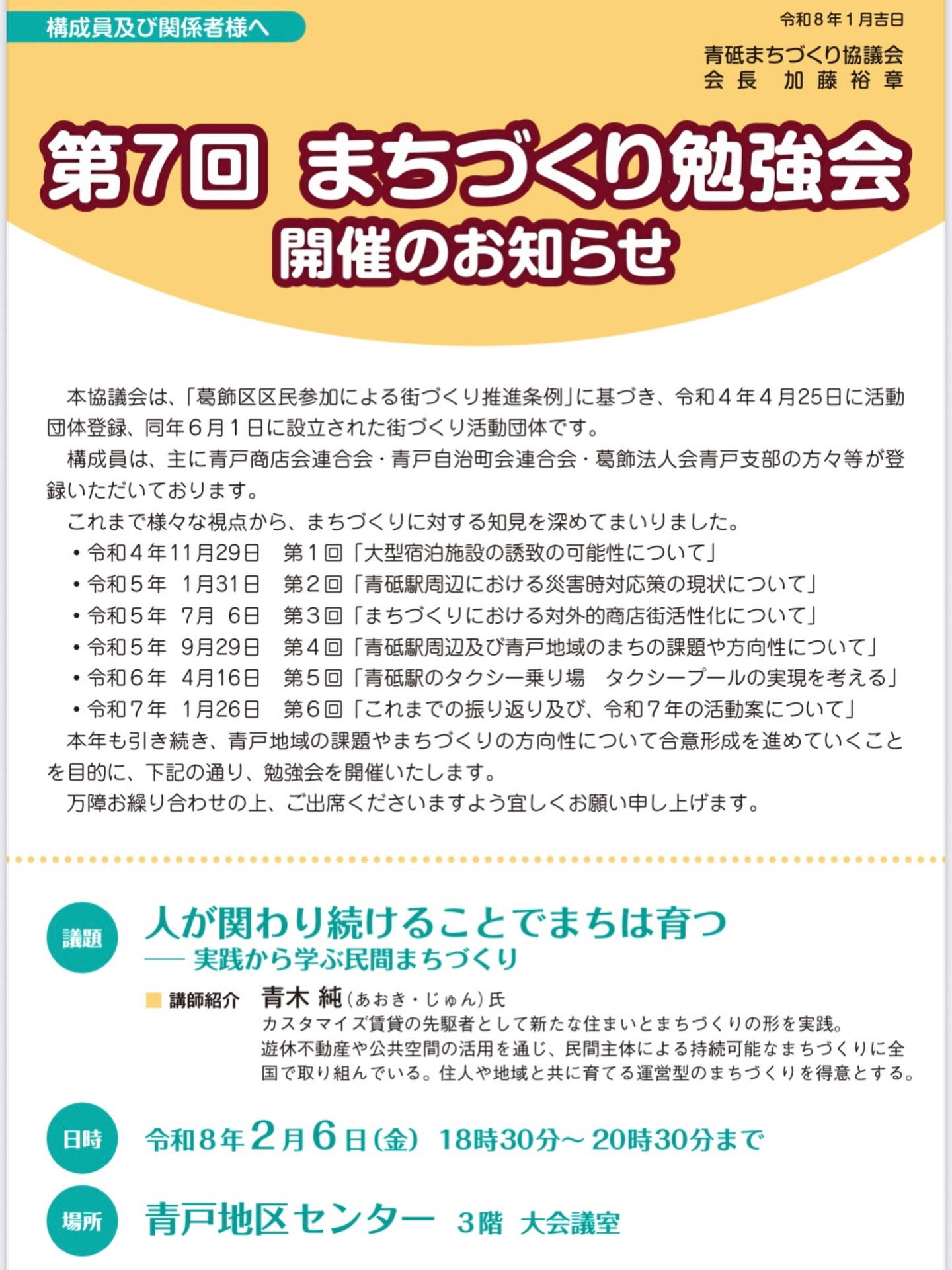 ℹ️第7回 まちづくり勉強会 開催のお知らせ まちは、人が関わり続けることで育っていきます。 これまで、商店会・自治町会・法人会の皆さまとともに、防災、駅前整備、商店街活性化など、さまざまなテーマで学びと対話を重ねてまいりました。 第7回となる今回は、民間主体で全国のまちづくりを実践してきた 青木 純さんをお迎えします。 遊休不動産や公共空間を活かし、 「住人や地域とともに育てるまちづくり」を実践から学びます。 ✅青砥駅を利用して通勤・通学されている方、青戸にお住まいの方、 そして、これからの青戸を担う次世代の皆さんにも、ぜひ参加してほしい勉強会です。 世代を越えて、立場を越えて、青戸のこれからを一緒に考えてみませんか。 🗓 令和8年2月6日(金) 18:30〜20:30 📍 青戸地区センター 3階 大会議室 #葛飾区 #青戸 #青砥駅 #まちづくり #葛飾区議会議員中村けいこ
