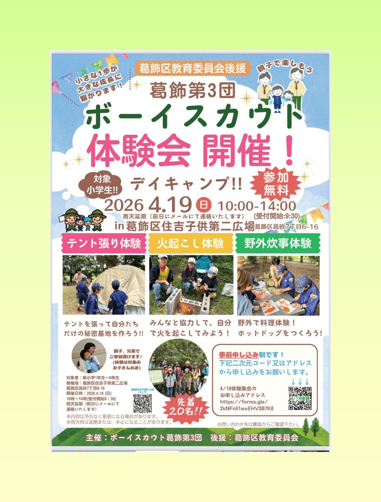 🌳🌳🌳🌳🌳🌳🌳 ⛺新小学1年生~6年生対象 ボーイスカウト体験デイキャンプ開催!🔥 🌳🌳🌳🌳🌳🌳🌳🌳🌳 テント張りや火起こし、 野外炊事など、 自然の中でさまざまな体験ができる ボーイスカウト葛飾第3団の体験会が開催されます🙌 🌭ホットドッグづくりにも挑戦! 「ボーイスカウトってどんなことをするの?」 という方も大歓迎😃 初めてのお子さんでも安心して参加できます🙆‍♀️ 親子・兄弟での参加も可能です (体験は対象のお子さんのみ) 📅2026年4月19日(日) ⏰10:00~14:00(受付9:30~) 📍葛飾区住吉子供第二広場 ※雨天延期(前日にメールでご連絡) この投稿をご覧になって 参加をご希望の方は 中村けいこまでご連絡ください。 体験会の申し込み先をご案内いたします。 ℹ️ボーイスカウト葛飾第3団 ■主な活動場所 青戸平和公園、水元公園、にいじゅくみらい公園 ■主な入団地域 金町・東金町・水元・柴又・新宿・住吉・白鳥・高砂・小岩・鎌倉・細田・奥戸・青戸・立石・綾瀬・亀有 ■参加対象 男女 ☺️☺️☺️☺️ #葛飾イベント #子ども体験 #ボーイスカウト #子どもと自然