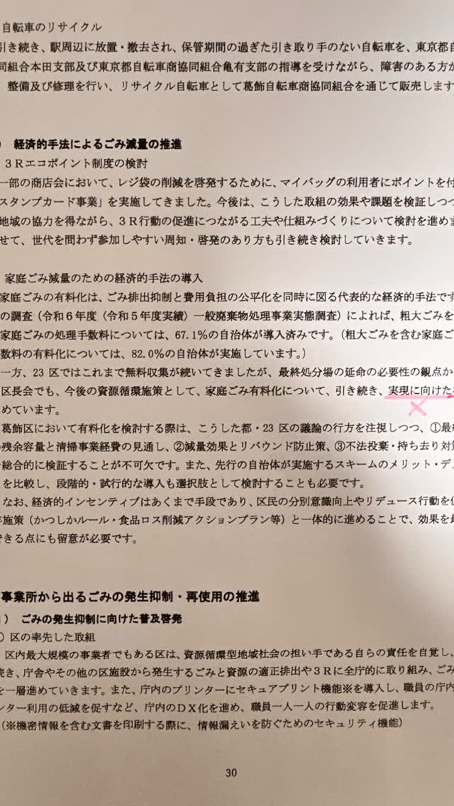 🗑️こんなのばかり 東京23区で家庭ごみ有料化の議論... 特別区長会長の吉住健一新宿区長は、 「23区一斉に有料化を始めるのが望ましい」と発言しています。 私は副委員長を務める葛飾区議会の【建設環境委員会】で、まさにこの問題にも関わる「葛飾区一般廃棄物処理基本計画(第4次)」改定版(案)の議論を行いました。 この(案)には、 「特別区長会でも、今後の資源循環施策として、家庭ごみ有料化について、実現に向けた検討を進めています。」という記載がありました。 しかし、有料化ありきの方向を前提にするべきではないと考え、梅沢議長とも相談し、「実現に向けた」という表現を撤回提言。 委員会終了後、文言削除に至りました。 メディアも、少し冷静に考えてほしいです😒 東京のごみは、この20年で大きく減っています⤵️ 23区の1人1日ごみ量は約450g。 全国平均のほぼ半分です。 そして「最終処分場あと50年」という説明は、私が1期目だった16年ほど前からほぼ同じ表現が続いているんですよ〜😅 課税や有料化は、一度始めたら廃止するのはとても難しいですよね⚠️ だからこそ、まずは焼却灰の減量技術やリサイクルなど、技術革新を最大限活用することが先ではないでしょうか??? 改選を控えている首長もいらっしゃるでしょうから、しばらくは声高らかには議論しないでしょうけど、生活費が上がり続けている中、区民負担を増やす政策は慎重に考えるべきだと思います👆⚠️ こんなのばっかりで とほほ😂 #ごみ有料化ストップ #東京23区 #暮らしを守る #葛飾区議会議員中村けいこ